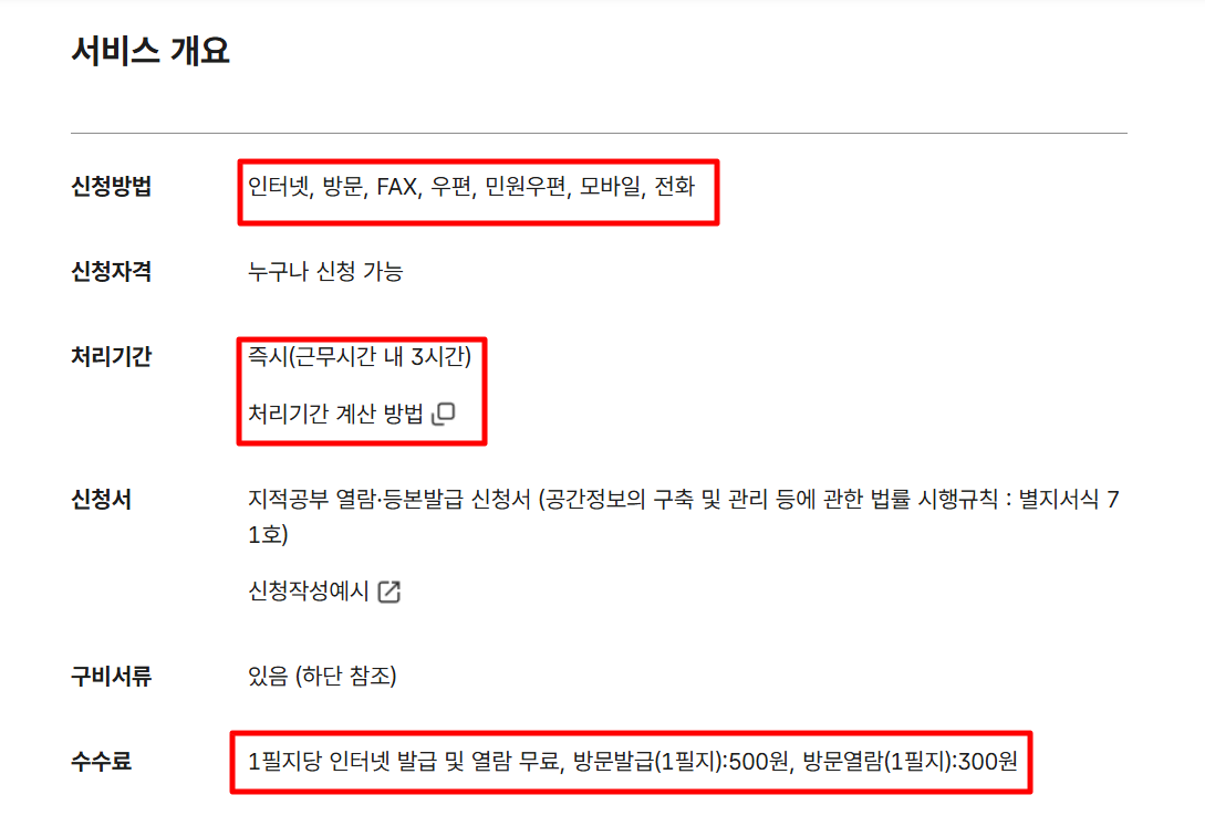 온라인에서 열람하는 것은 무료지만, 발급 시 500원 내외의 비용이 발생할 수 있습니다.